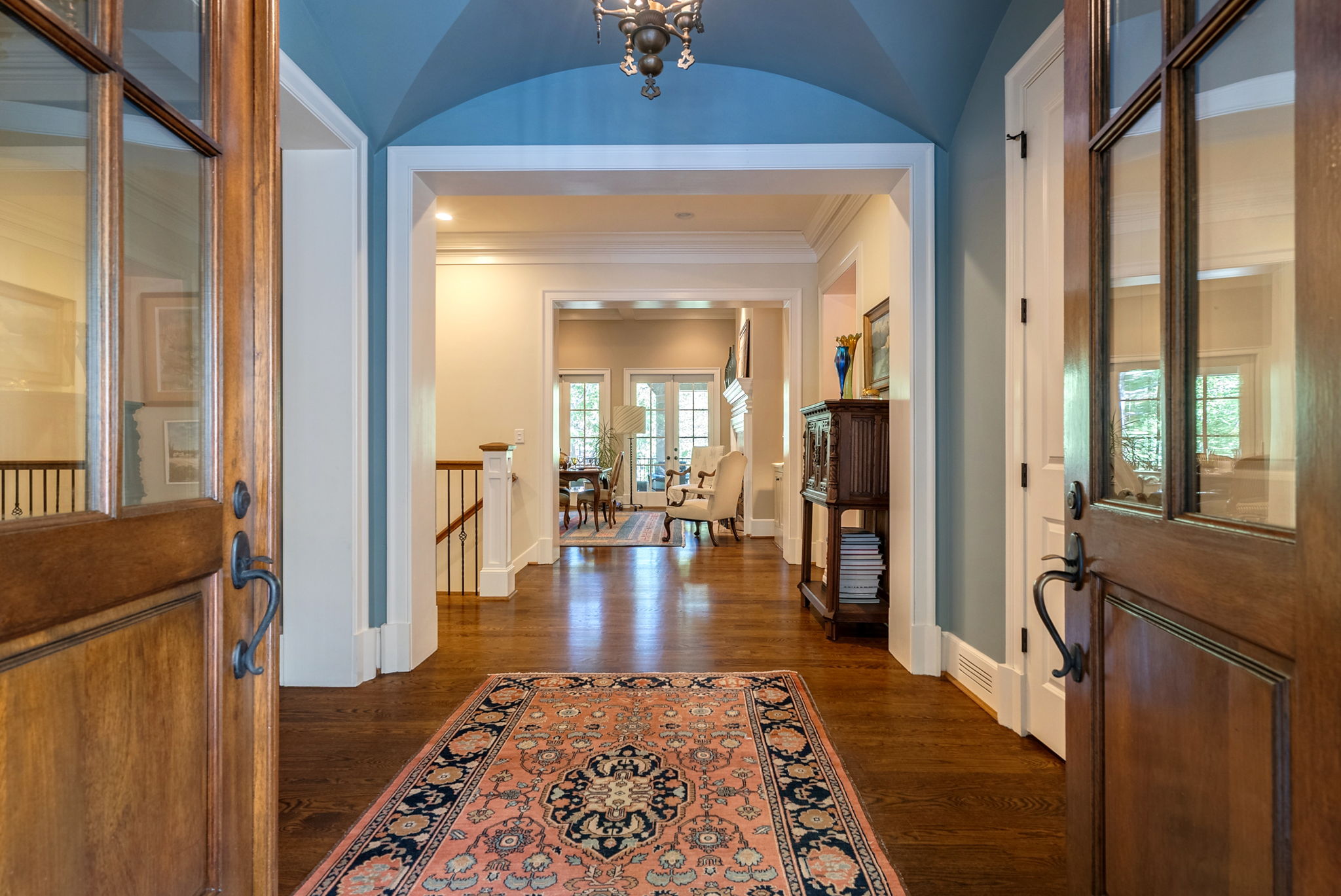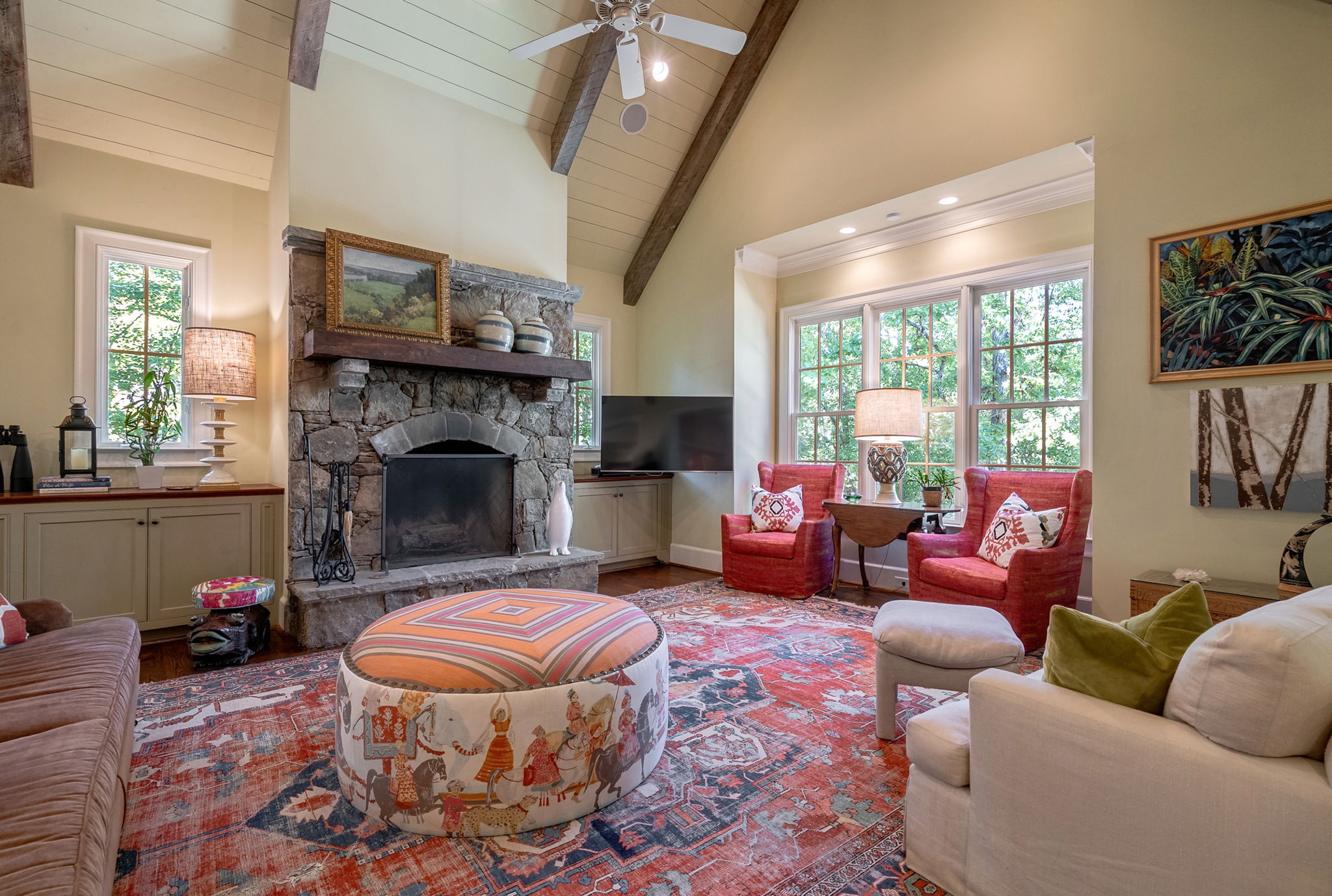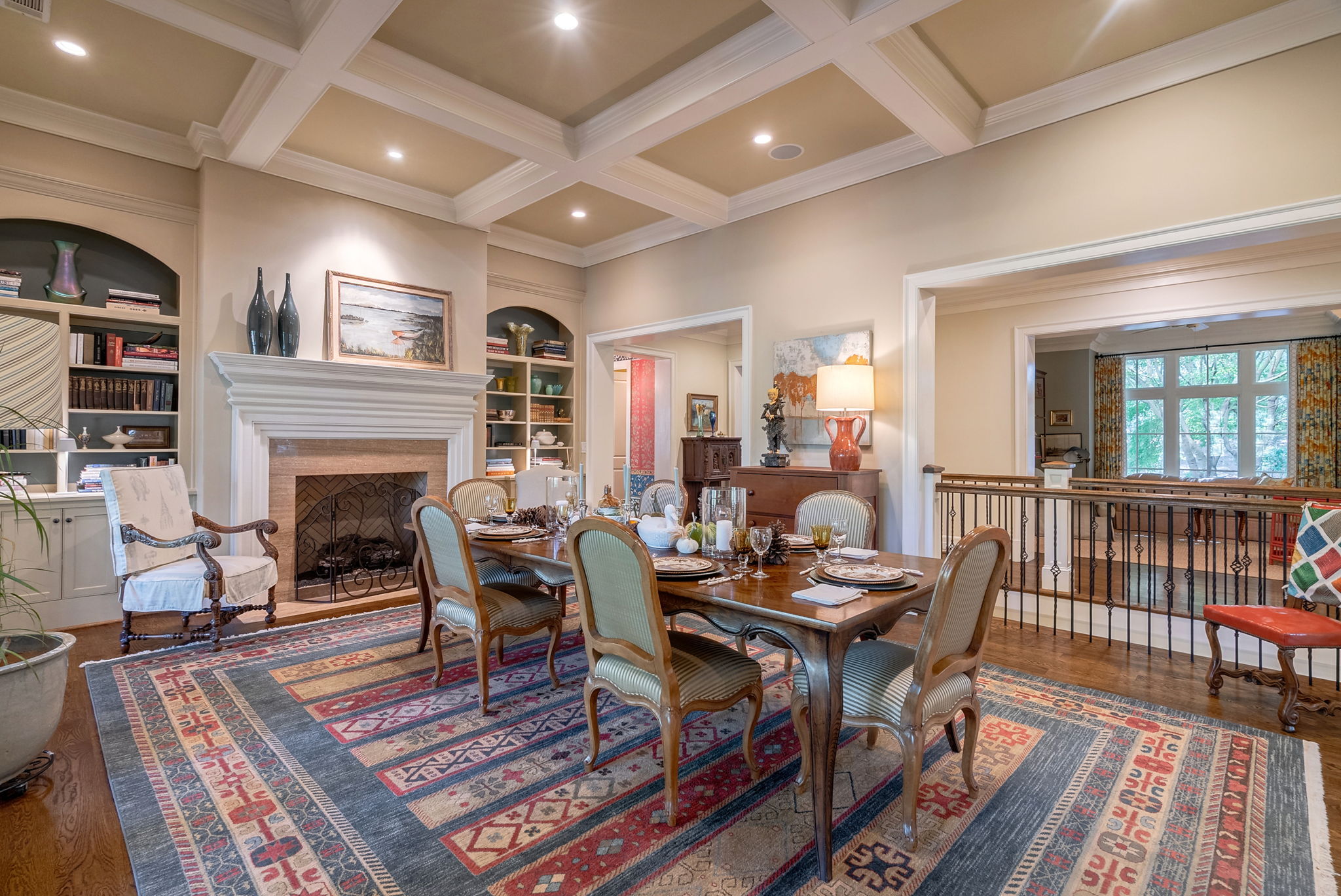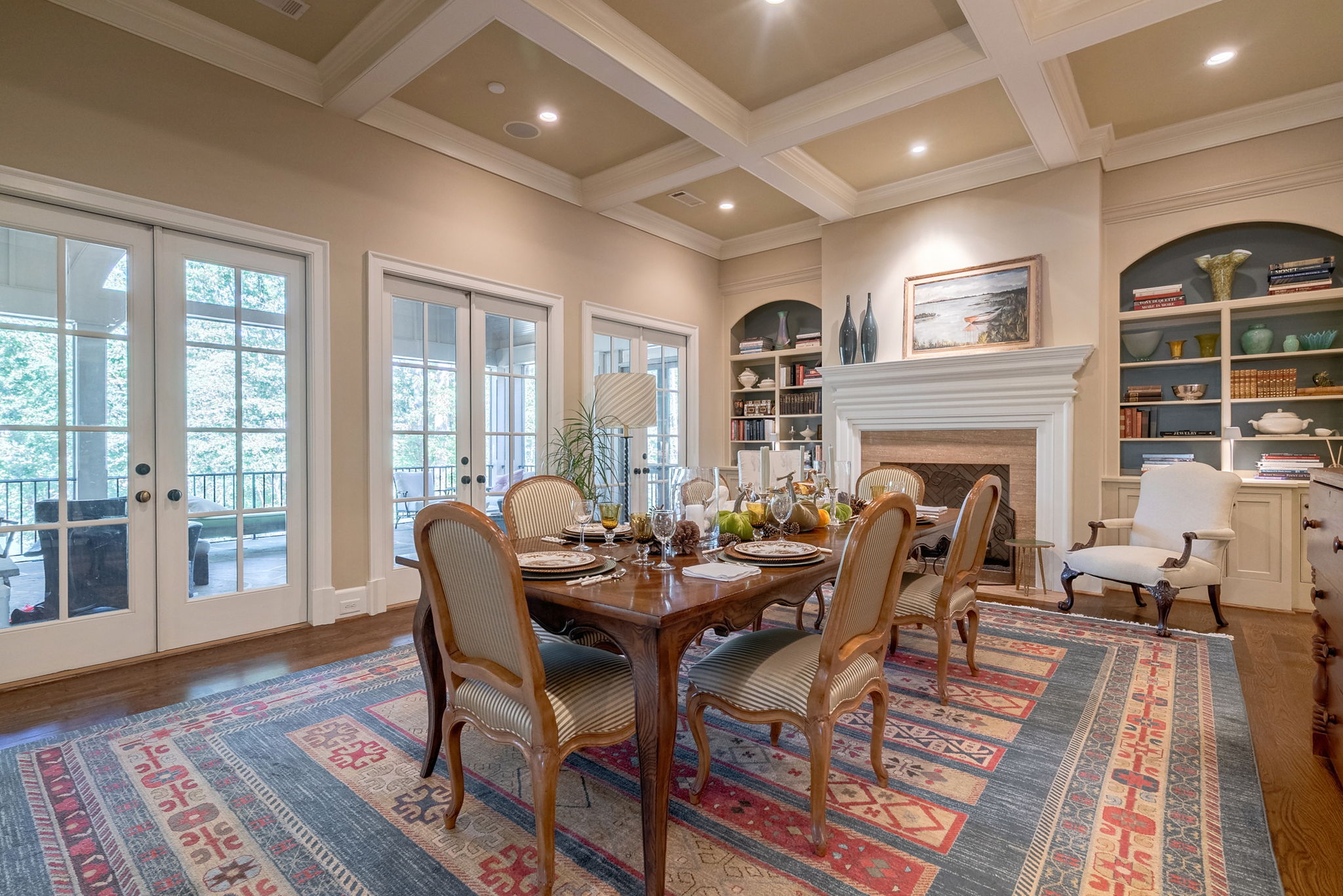 Inside, the chef’s kitchen features Wolf, Sub-Zero, and Cove appliances, a quartzite island, and farmhouse sink, opening to a keeping room with a wood-burning fireplace. The formal dining room includes a gas-log fireplace, custom built-ins, and a coffered ceiling—ideal for elegant gatherings.