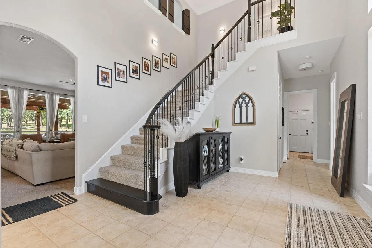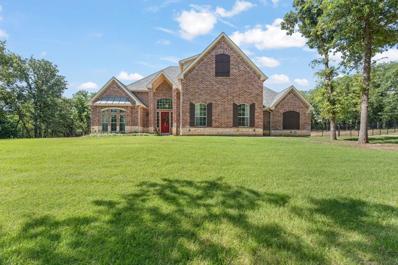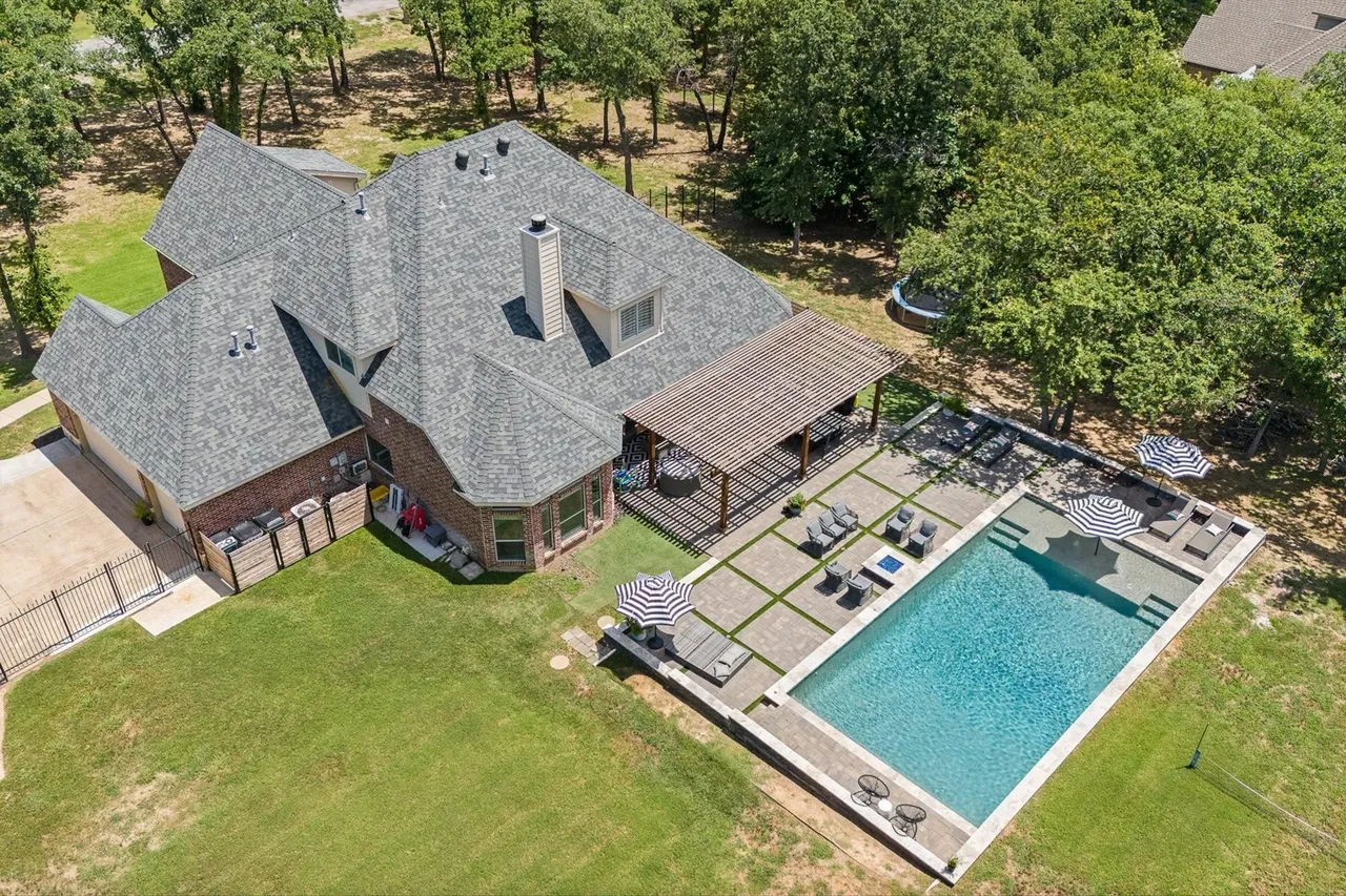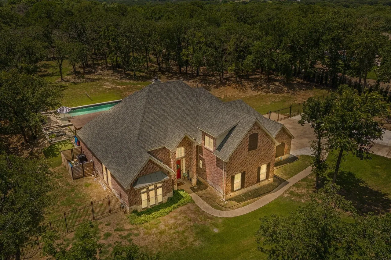 Welcome to this stunning custom home on 2.6 wooded acres in the gated community of Boling Ranch Estates—located just outside of city limits and only 20 minutes from downtown Fort Worth. An impressive entry and foyer lead to a vaulted formal dining room, a private study with serene views of the oak-shaded lawn, and an open-concept living area that flows seamlessly into a chef’s kitchen featuring custom cabinetry, stainless steel appliances, a gas range, and a large island perfect for entertaining. The spacious first floor includes a luxurious primary suite with a vaulted ceiling, jetted tub, separate walk-in shower, and oversized walk-in closet, along with a private guest or in-law suite for added flexibility. Upstairs, you’ll find two additional bedrooms connected by a Jack-and-Jill bath and a large bonus room ideal for a game or media space. Recent updates include fresh paint, upgraded light fixtures, new blown-in attic insulation, and a serviced HVAC system. Step into your own private backyard oasis complete with a brand-new, resort-style pool, a stylish pergola, and a wrought iron fence enclosing the beautifully wooded lot. Surrounded by nature, the neighborhood is known for its peaceful atmosphere and frequent deer sightings—these gentle visitors wander freely throughout the entire community. With tall ceilings, abundant natural light, and a layout designed for multigenerational living, this home offers the perfect blend of country charm and city convenience.