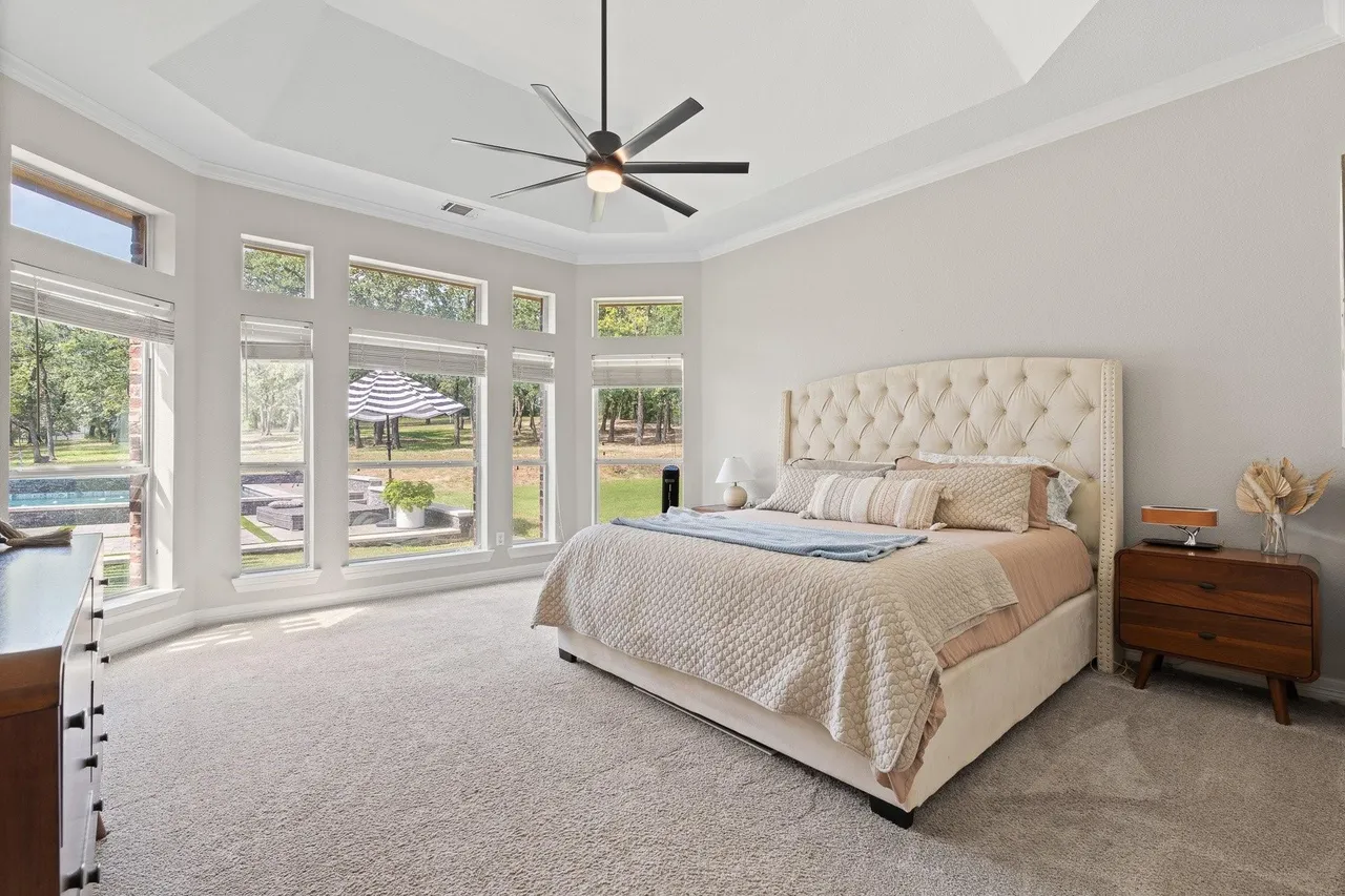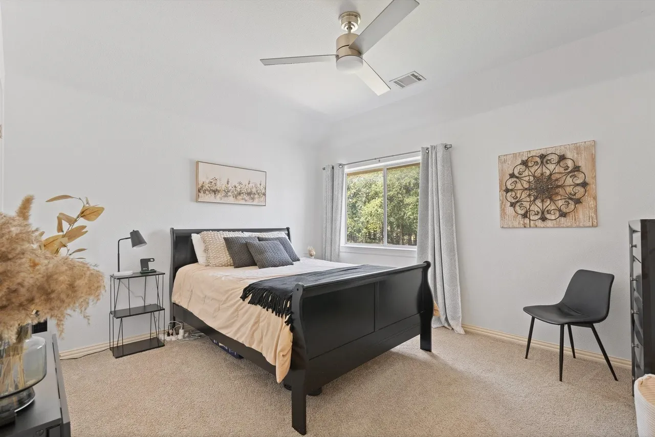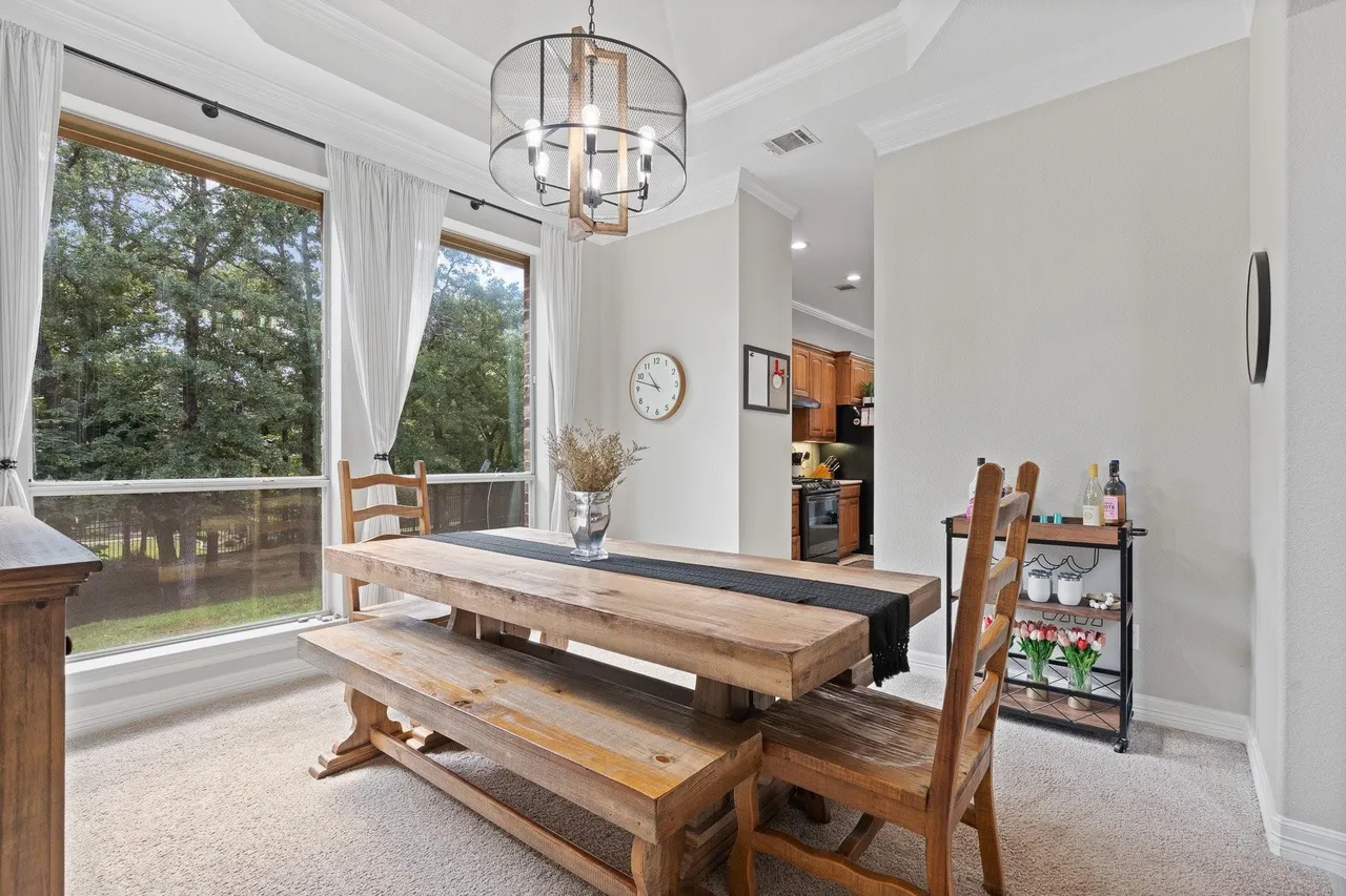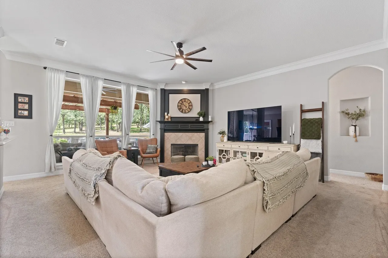 Welcome to this stunning custom home on 2.6 wooded acres in the gated community of Boling Ranch Estates—located just outside of city limits and only 20 minutes from downtown Fort Worth. An impressive entry and foyer lead to a vaulted formal dining room, a private study with serene views of the oak-shaded lawn, and an open-concept living area that flows seamlessly into a chef’s kitchen featuring custom cabinetry, stainless steel appliances, a gas range, and a large island perfect for entertaining. The spacious first floor includes a luxurious primary suite with a vaulted ceiling, jetted tub, separate walk-in shower, and oversized walk-in closet, along with a private guest or in-law suite for added flexibility. Upstairs, you’ll find two additional bedrooms connected by a Jack-and-Jill bath and a large bonus room ideal for a game or media space. Recent updates include fresh paint, upgraded light fixtures, new blown-in attic insulation, and a serviced HVAC system. Step into your own private backyard oasis complete with a brand-new, resort-style pool, a stylish pergola, and a wrought iron fence enclosing the beautifully wooded lot. Surrounded by nature, the neighborhood is known for its peaceful atmosphere and frequent deer sightings—these gentle visitors wander freely throughout the entire community. With tall ceilings, abundant natural light, and a layout designed for multigenerational living, this home offers the perfect blend of country charm and city convenience.