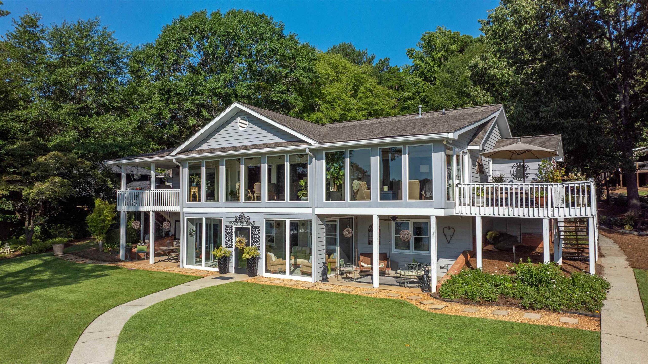 Enjoy multiple outdoor living spaces including covered porches, grilling deck, and a lakeside patio designed for entertaining.