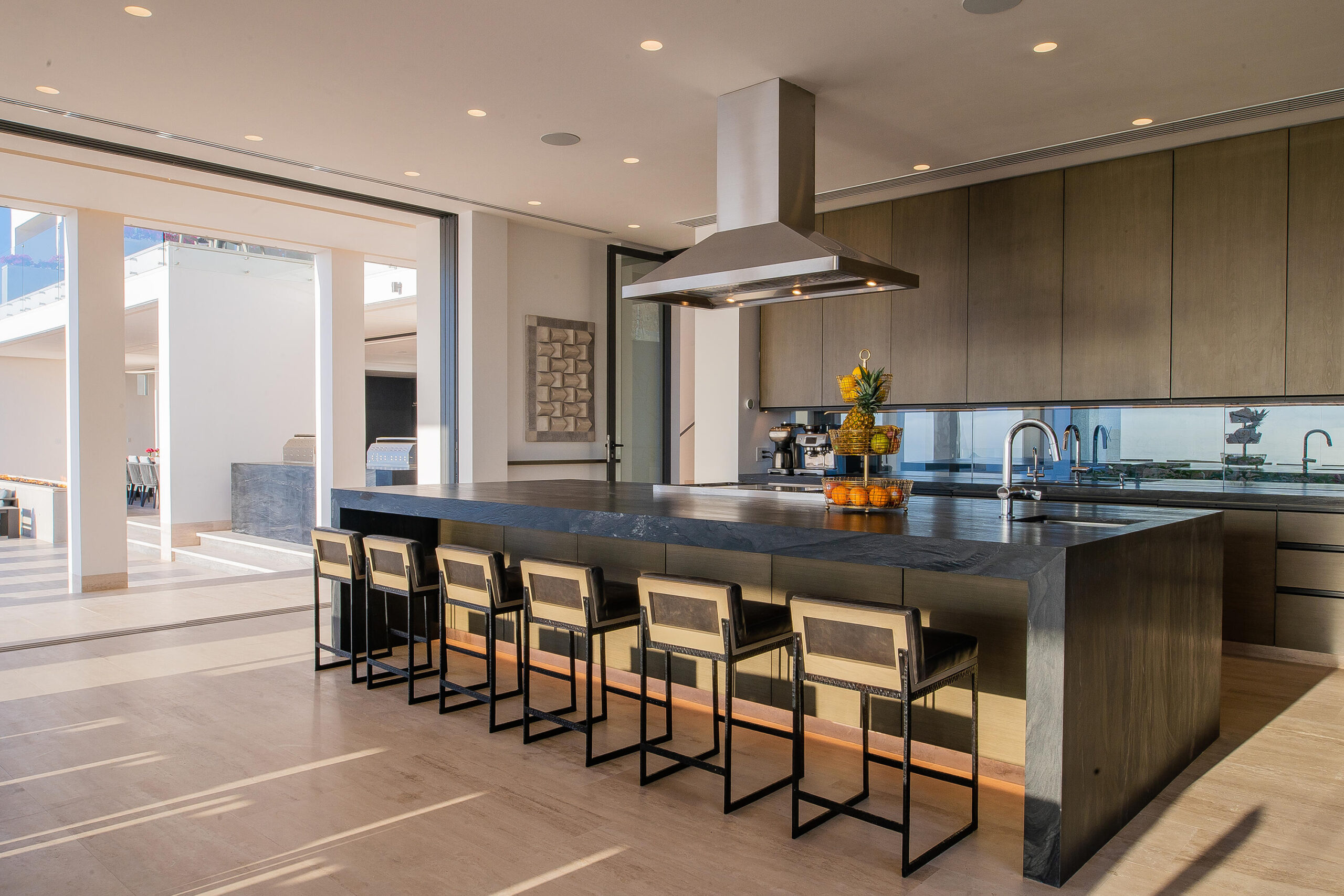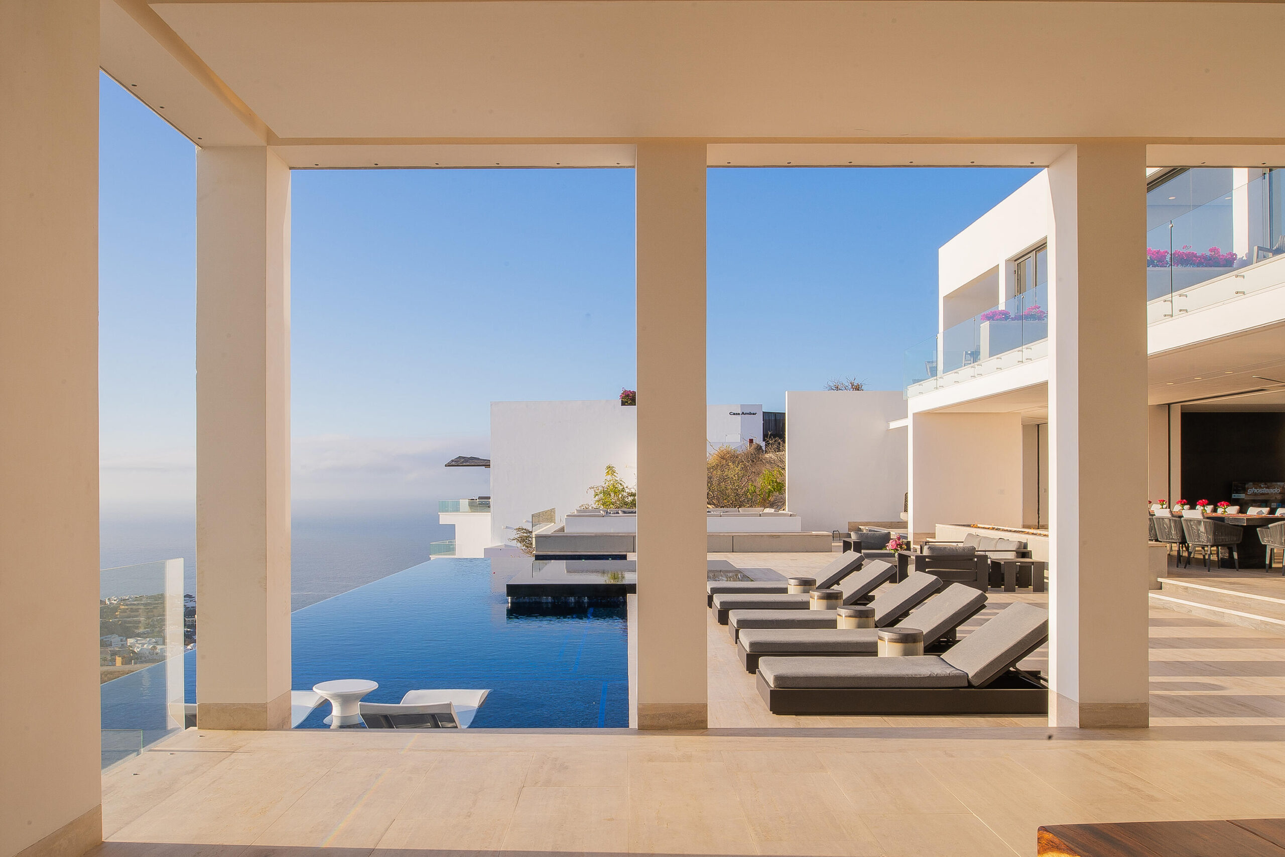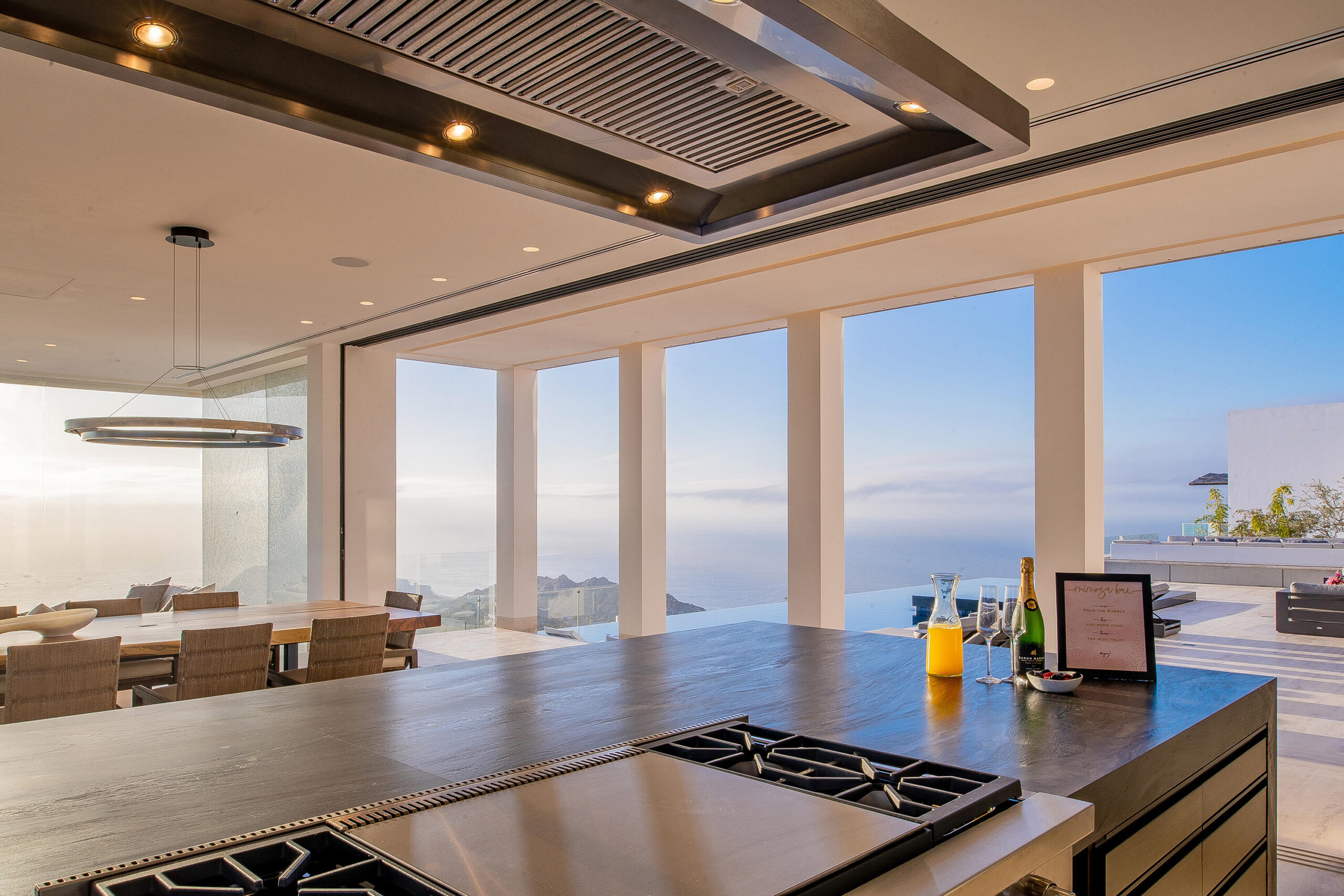The architecture balances openness with restraint. Throughout the home, sight lines are carefully composed, allowing sky and sea to remain a constant presence. Large living areas connect fluidly, framed by glass that opens fully and softens the transition between indoors and out. Spaces for gathering and retreat are considered equally, with 3 fire lit seating areas, a jacuzzi, and an infinity pool that visually extends toward the horizon. Interiors are equipped for both comfort and daily living, including a sauna, fitness area, game room, and a series of well appointed bedroom suites.