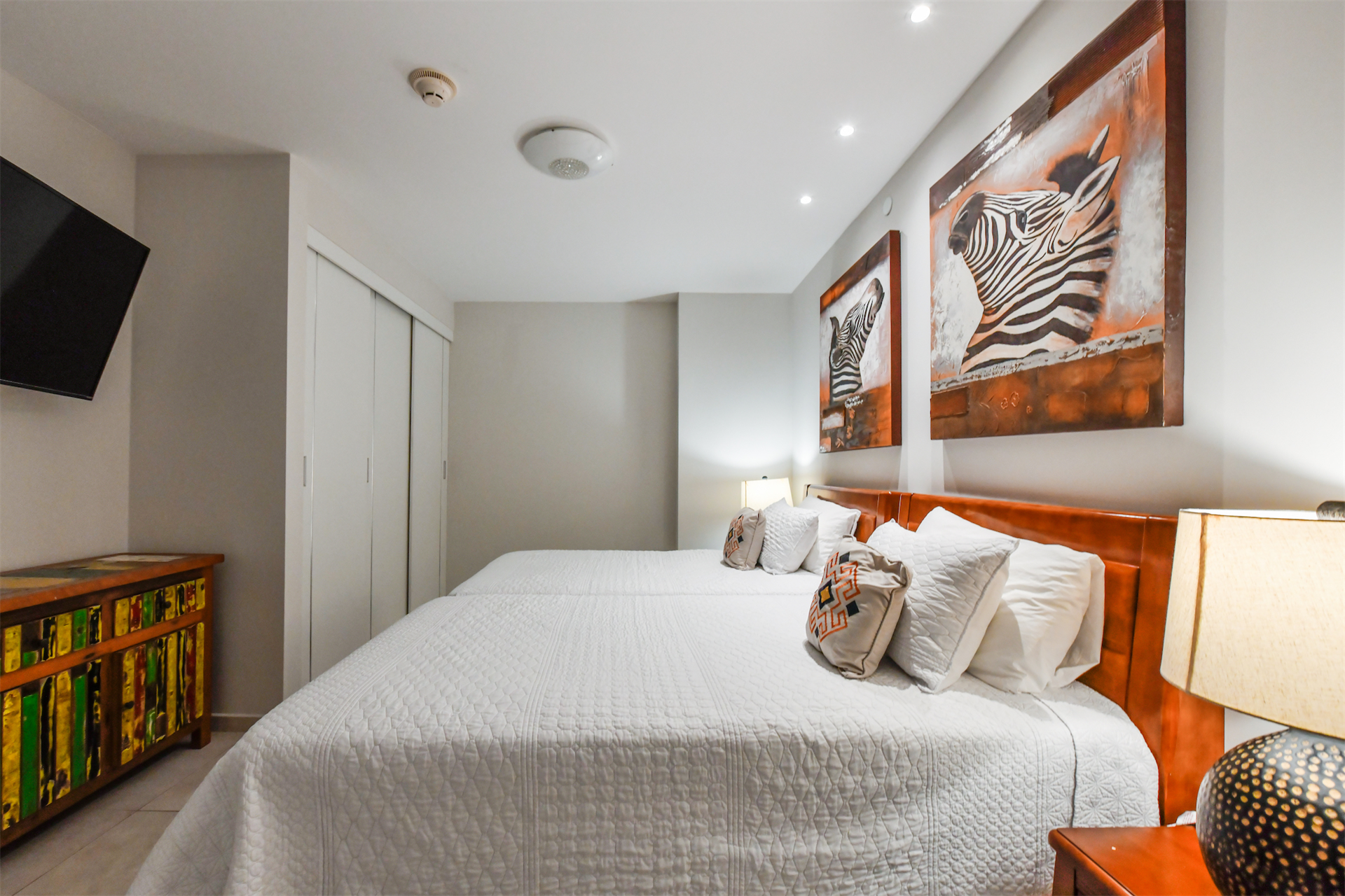 Unit 41 features two spacious bedrooms designed for ultimate comfort. The primary bedroom offers direct access to a private balcony with picturesque views of Eagle Beach and nearby parks, creating a peaceful haven. It includes an en-suite bathroom with double sinks, a private toilet, and a large walk-in closet for ample storage.
