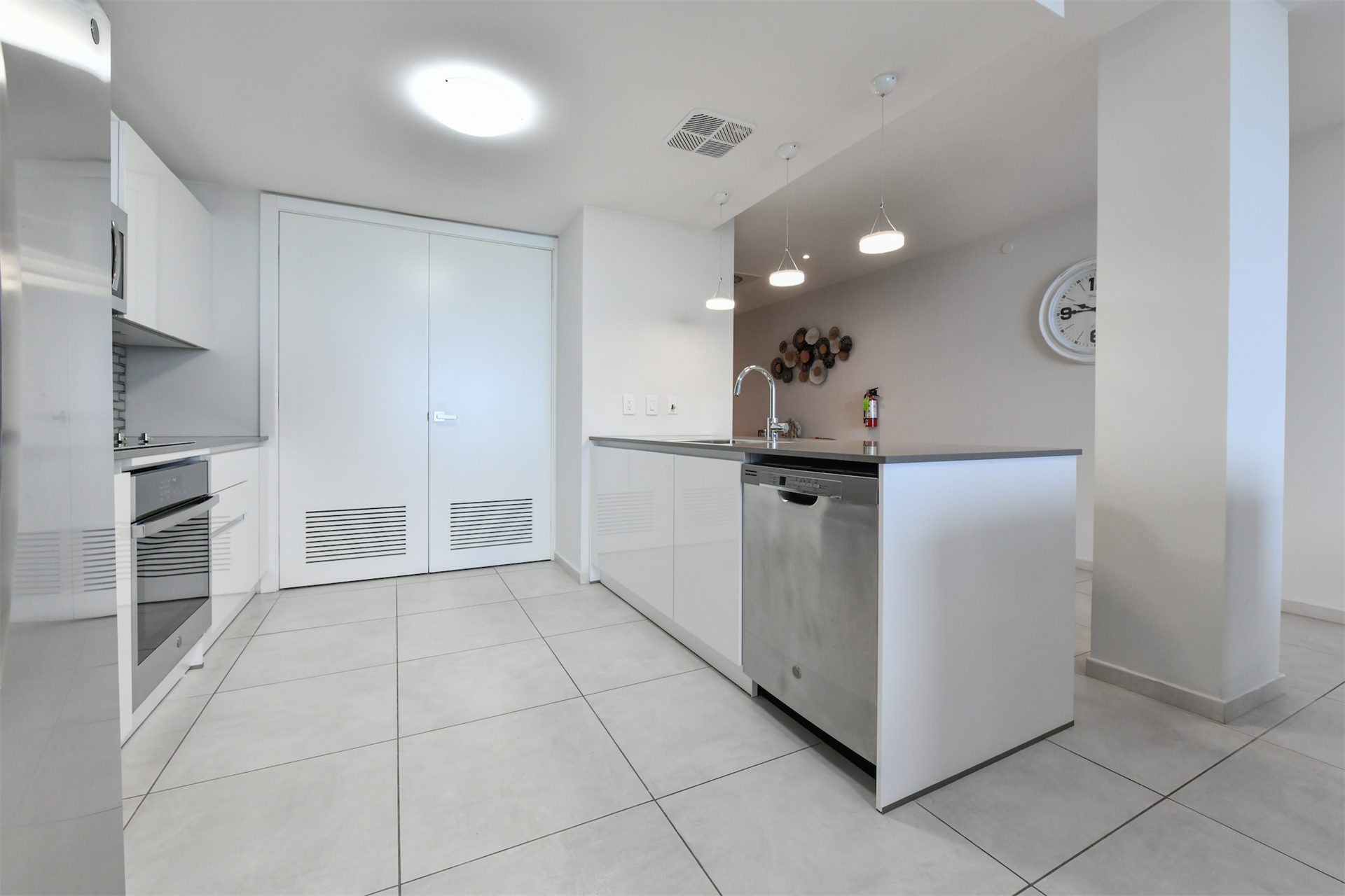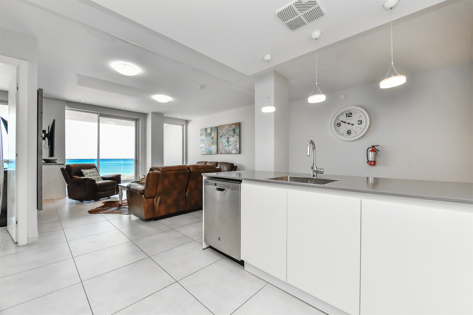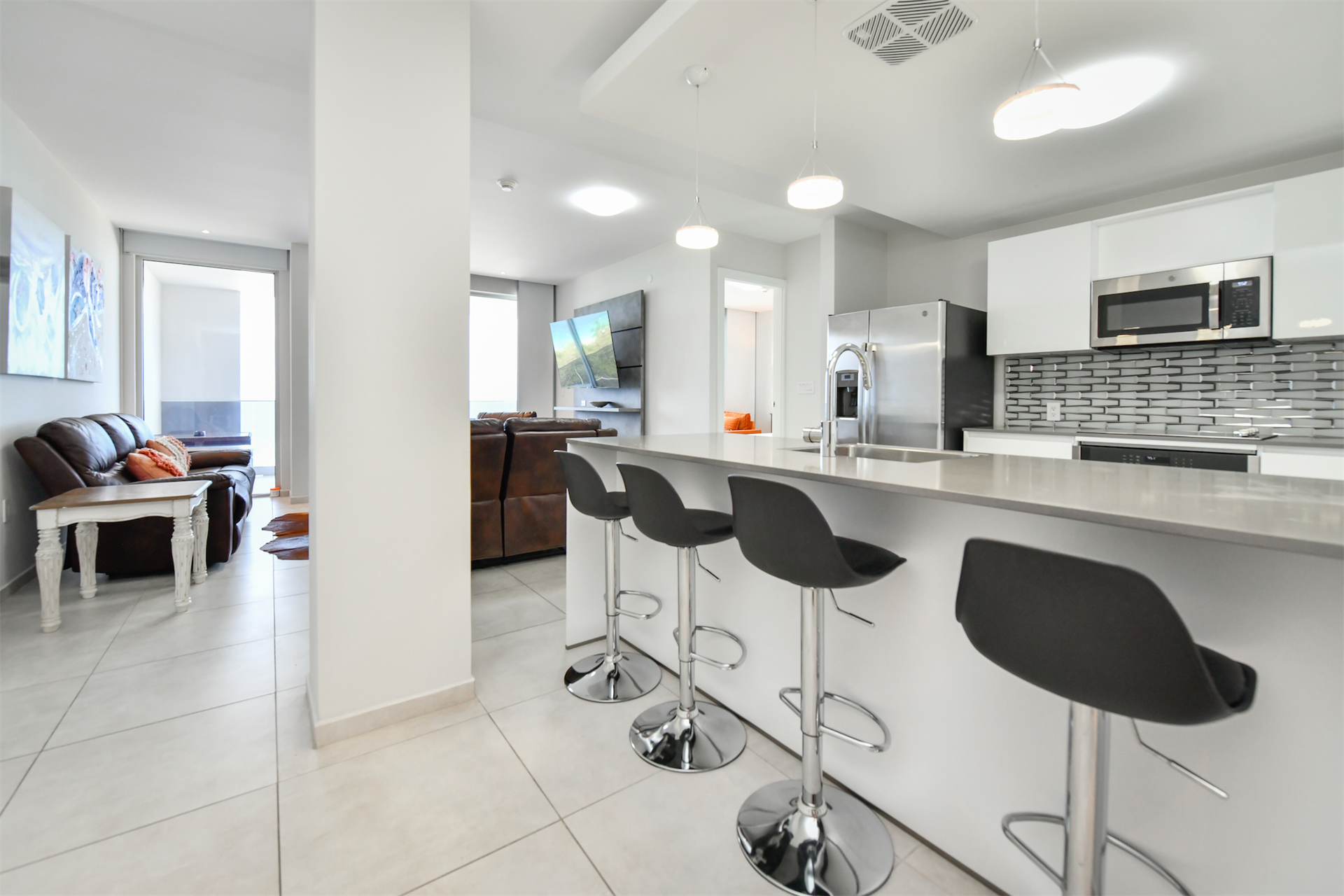 The living room is flooded with natural light from modern sliding doors that lead to your private balcony. Here, you can relax and take in the breathtaking ocean views. Whether you want to bask in the sunshine or enjoy some shade, the elegant blinds give you complete control over your ambiance.