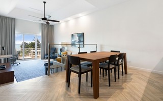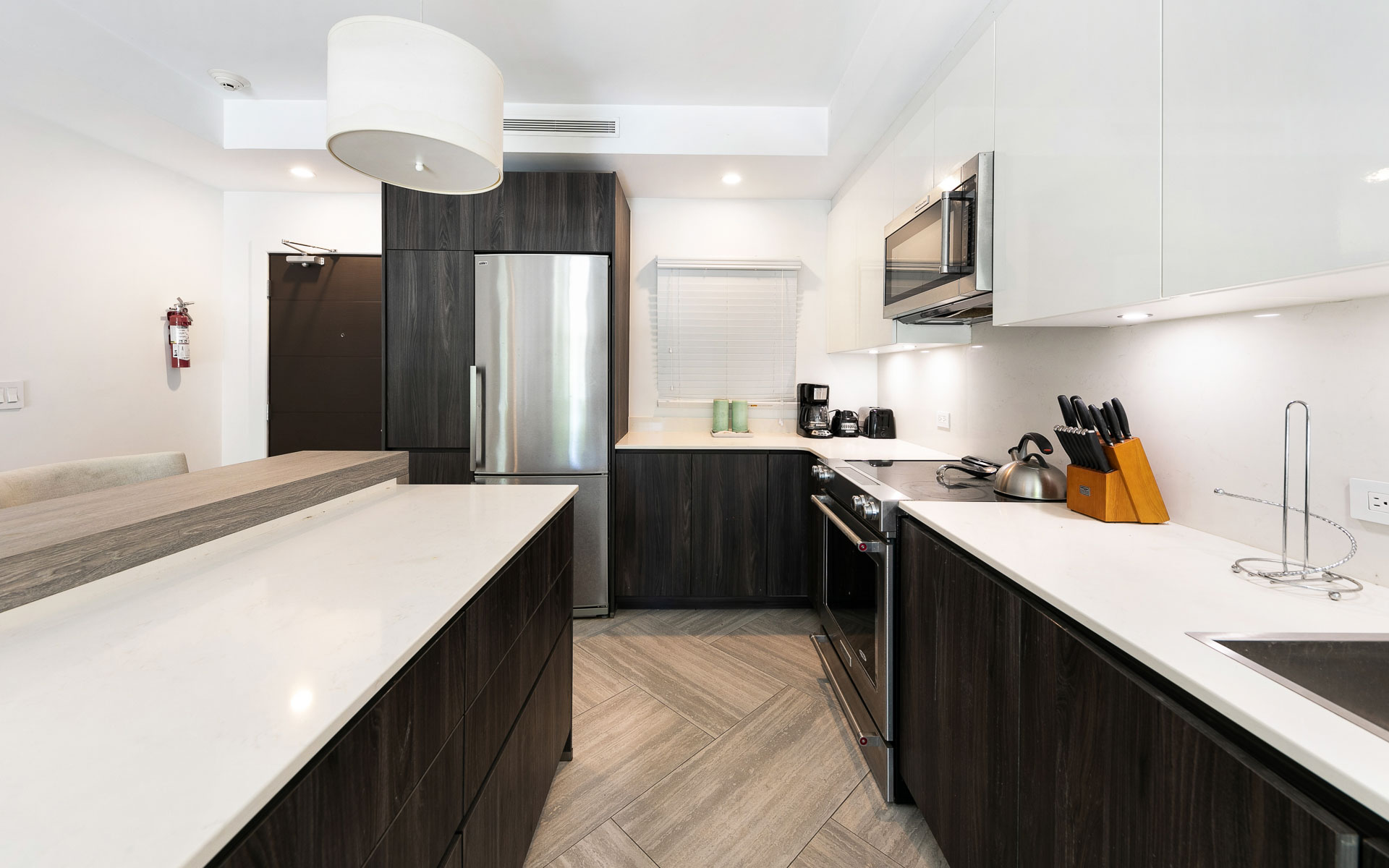 The current building is configured as follows: there are four penthouses—two with two bedrooms and two with three bedrooms. All penthouses feature soaring 14-foot ceilings and top-of-the-line appliances, including wine coolers. The three-bedroom units offer spacious master bathrooms with standalone bathtubs and bidets. In addition, there are ten two-bedroom, two-bathroom units, each equipped with Viking appliances and wine coolers, as well as two one-bedroom units with a den. Every residence boasts large ocean-facing terraces and in-unit laundry facilities. All ocean facing french doors have fully automated roll down shutters.