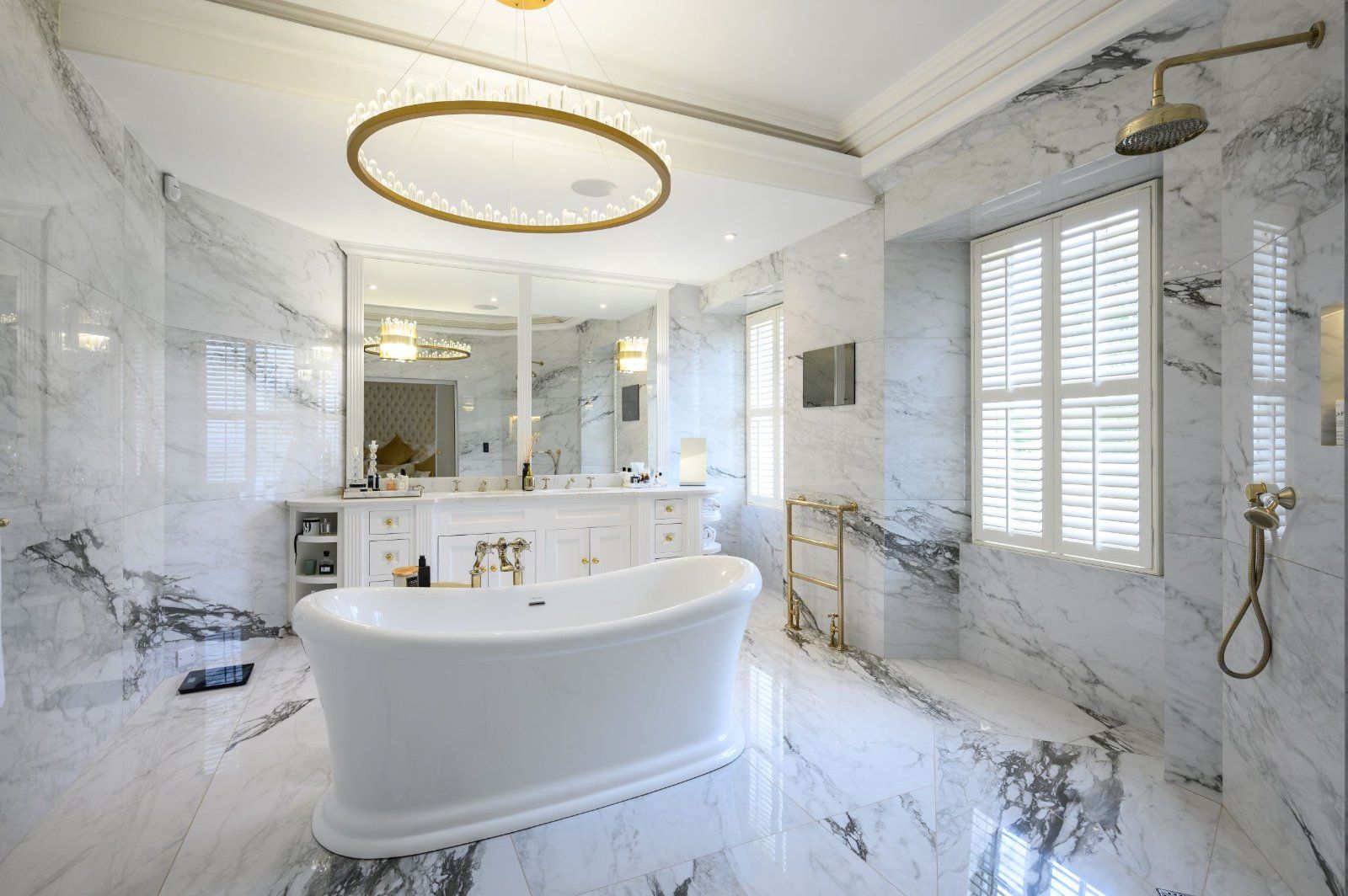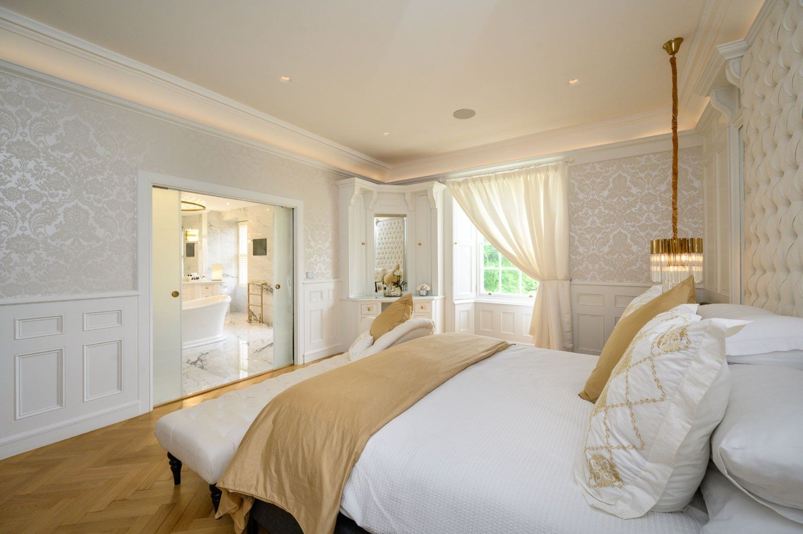 Upstairs, luxurious bedroom suites feature Italian marble bathrooms and handcrafted finishes throughout. Enhanced by a Loxone smart home system, underfloor heating, and landscaped gardens with stables and a tennis court, Ormiston Castle blends timeless heritage with refined modern comfort.