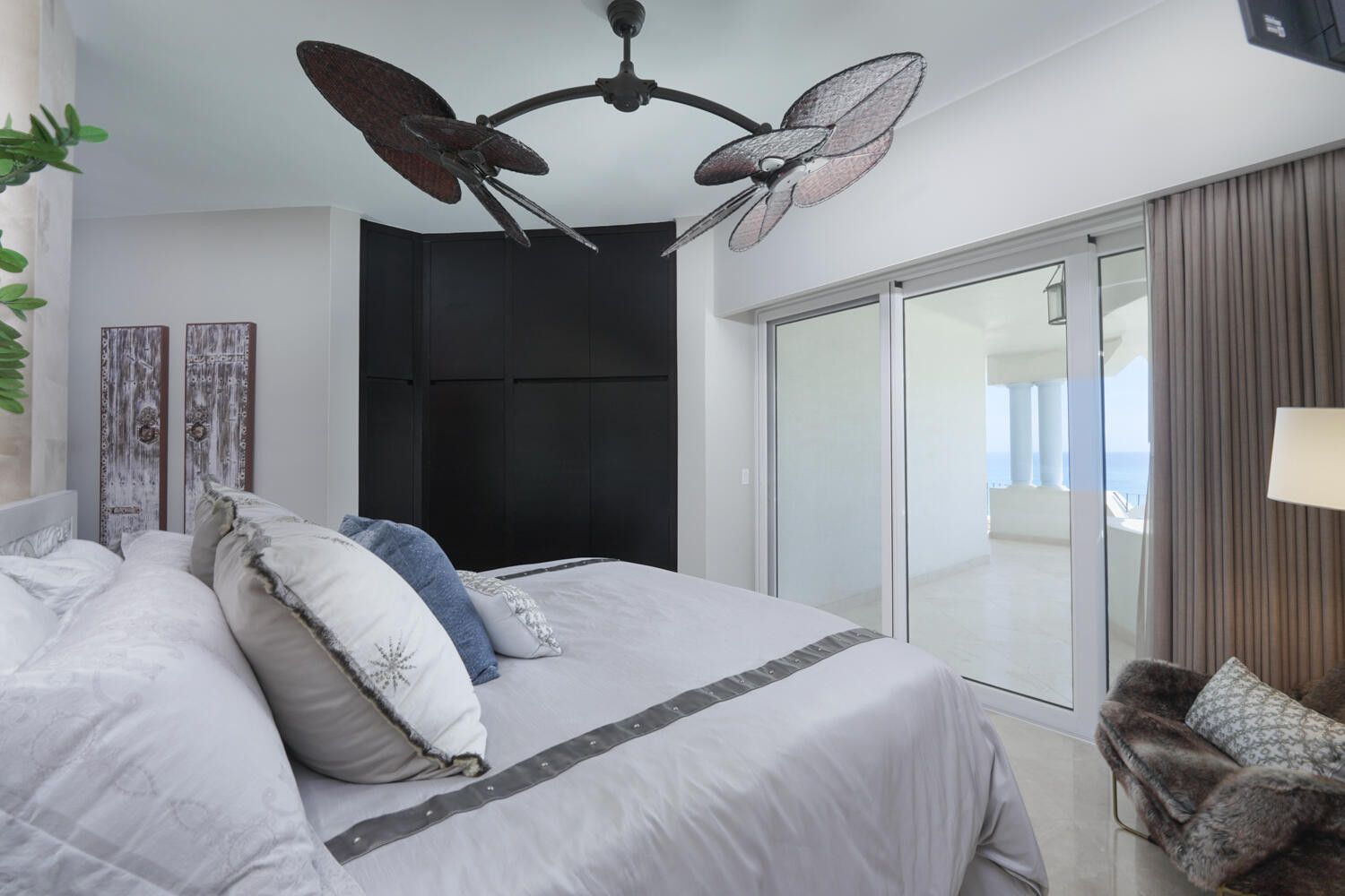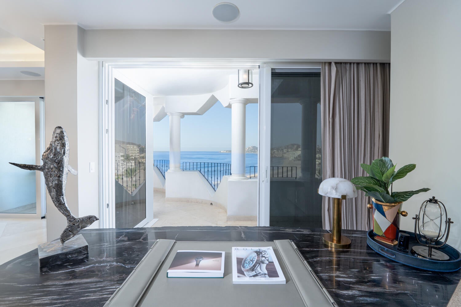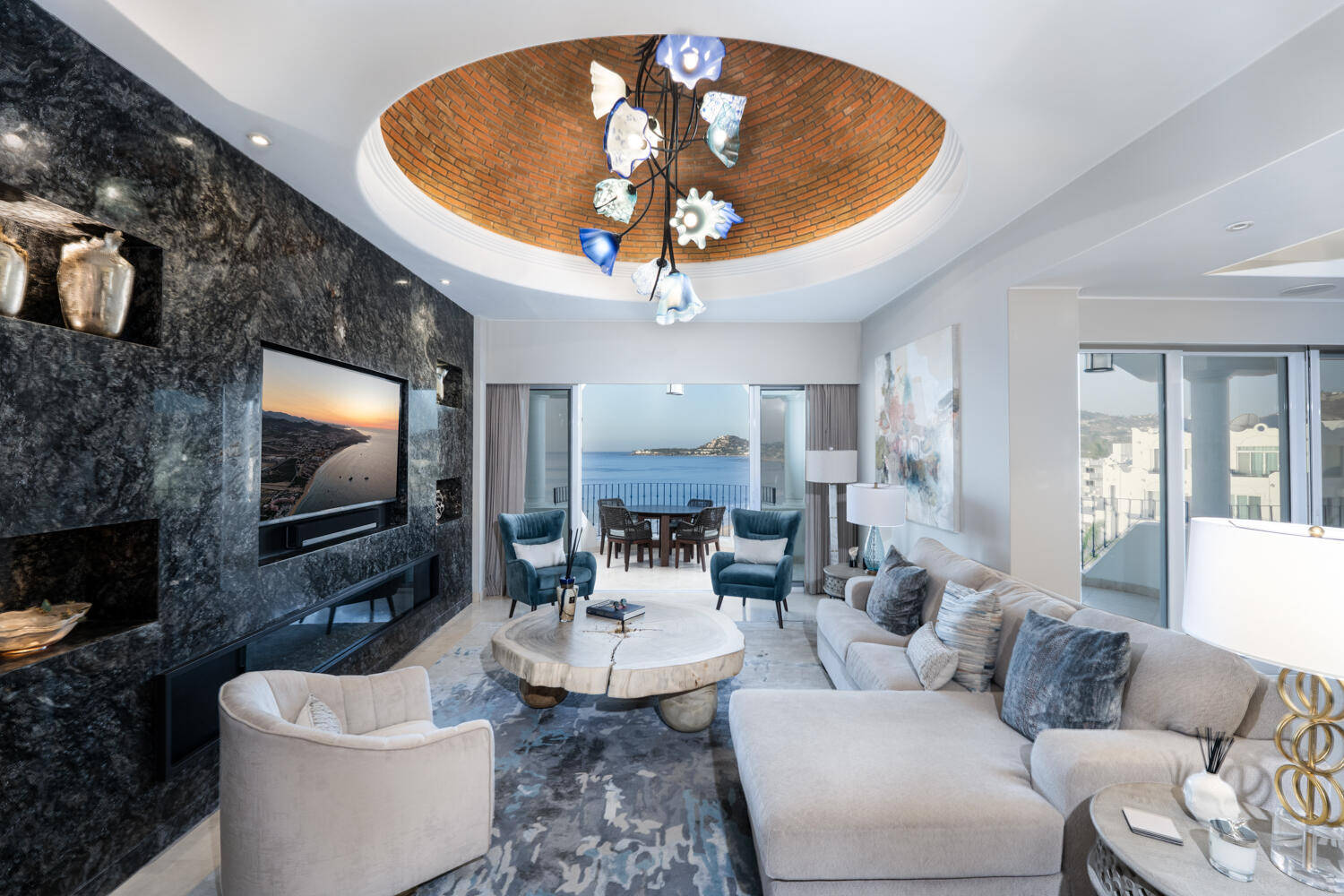 High above the shoreline of the San Jose Del Cabo Corridor, a penthouse at Mykonos frames uninterrupted westward views of the Sea of Cortez and Palmilla Point. Designed for both serenity and sophistication, the residence spans three ensuite bedrooms and four full bathrooms, one enhanced with a steam shower for a spa-like escape.