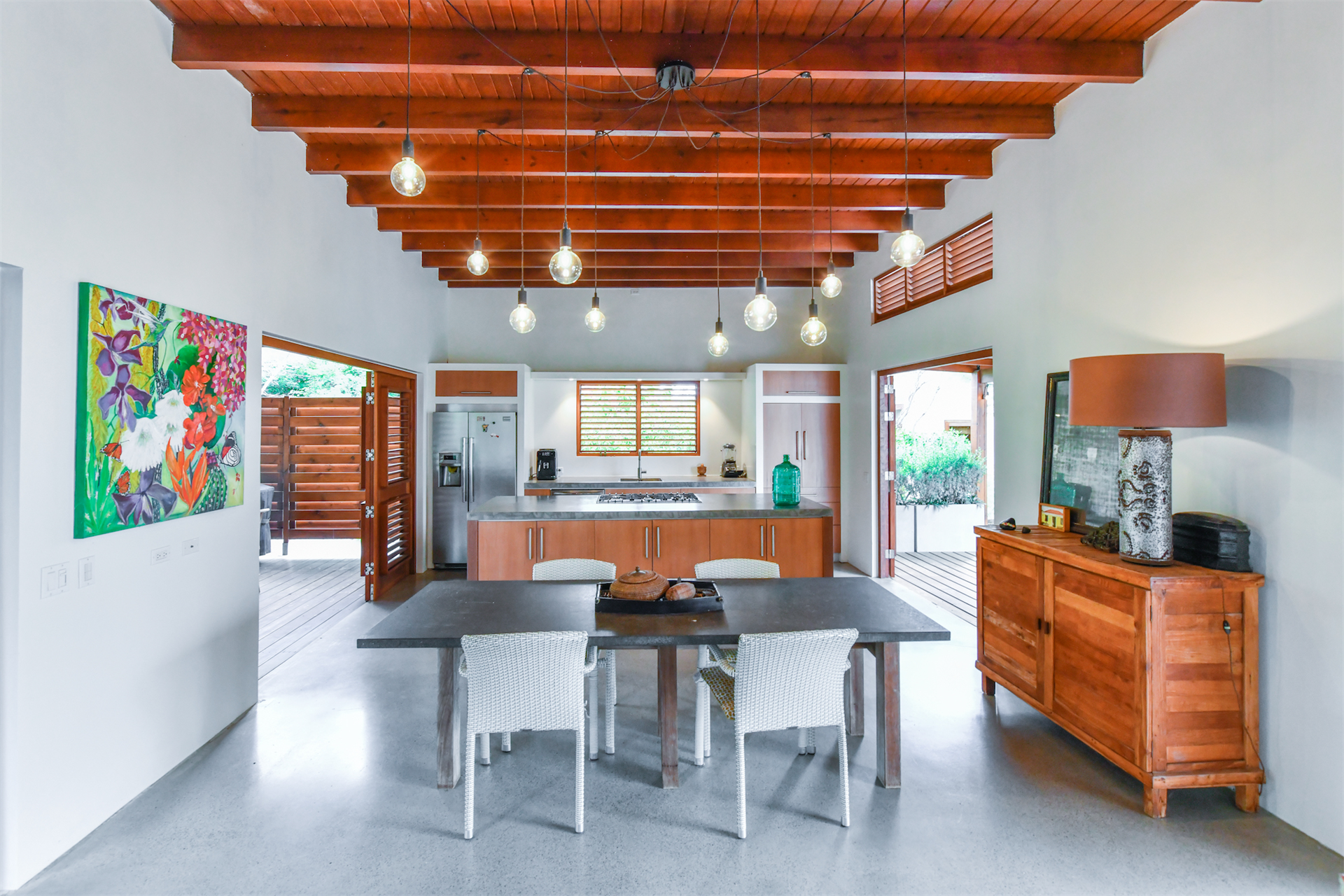 The main home showcases a harmonious blend of traditional and modern design, highlighted by large wooden doors throughout the living spaces. These doors can be opened to bring the outdoors inside, allowing natural light and fresh air to flow freely. This L-shaped house has a thoughtful layout with three spacious bedrooms and 2.5 bathrooms. A central hallway offers additional storage, and a convenient laundry area is tucked away. The open-plan kitchen is equipped with a dishwasher and seamlessly connects to the living and dining areas, creating a perfect space for entertaining or family gatherings.