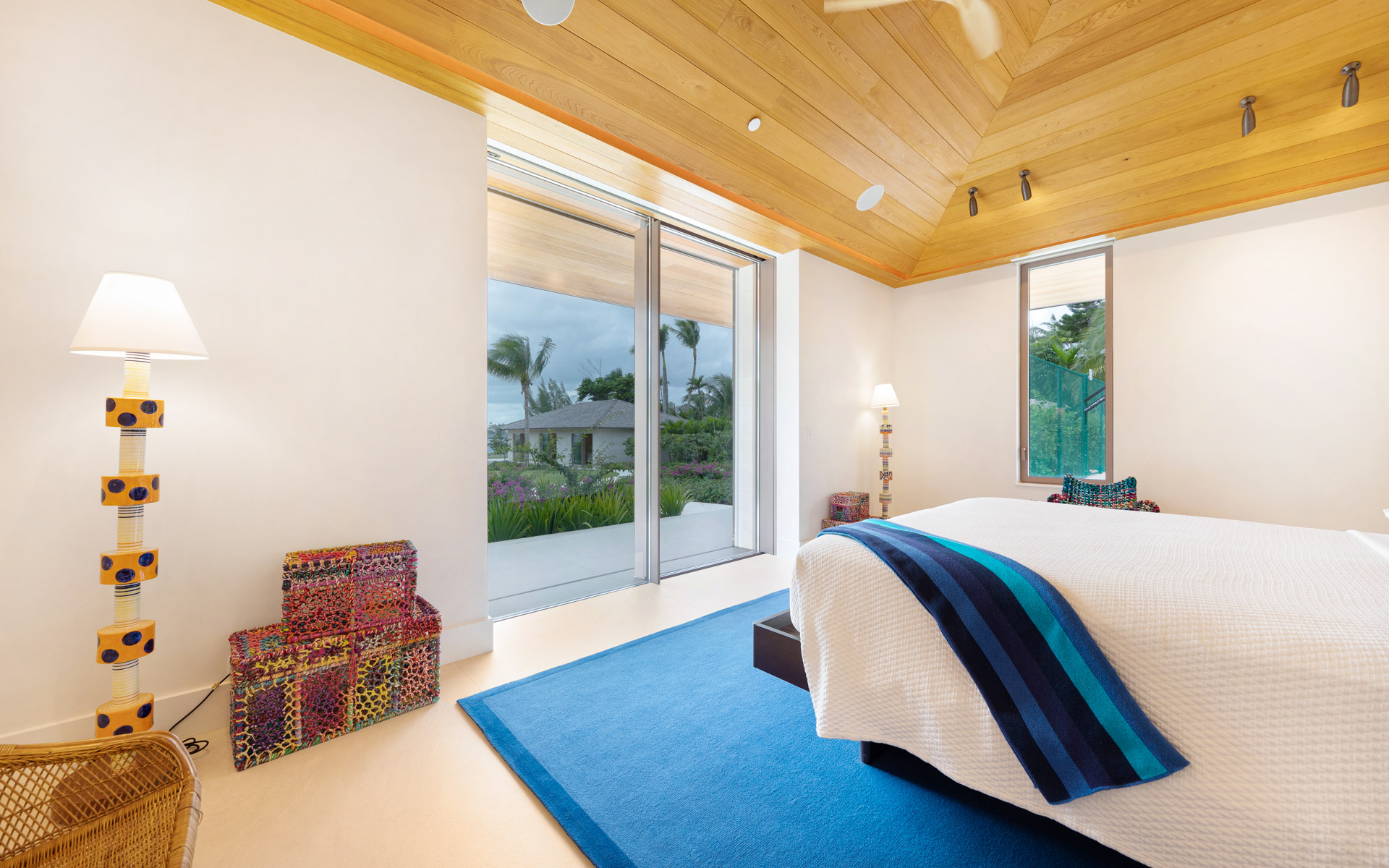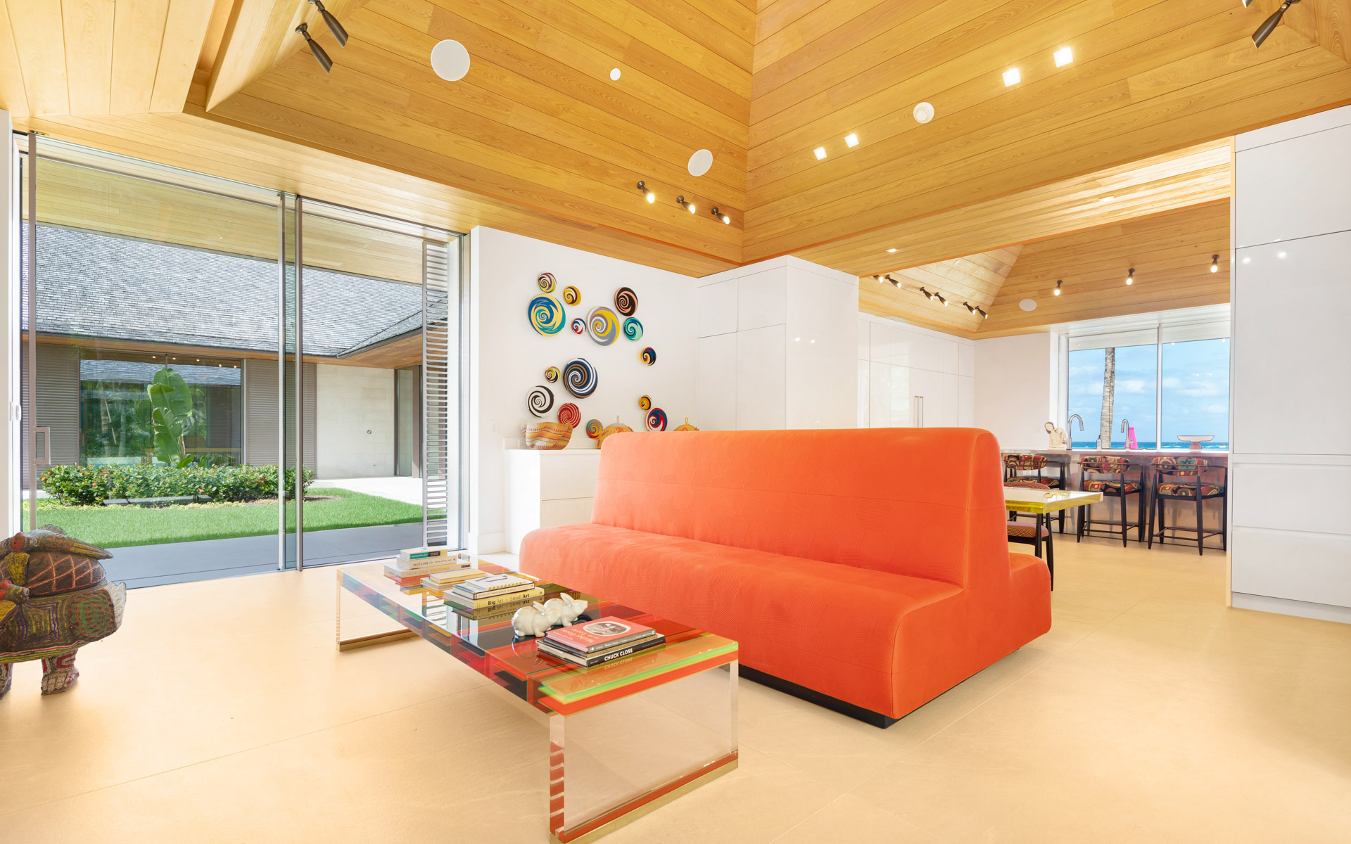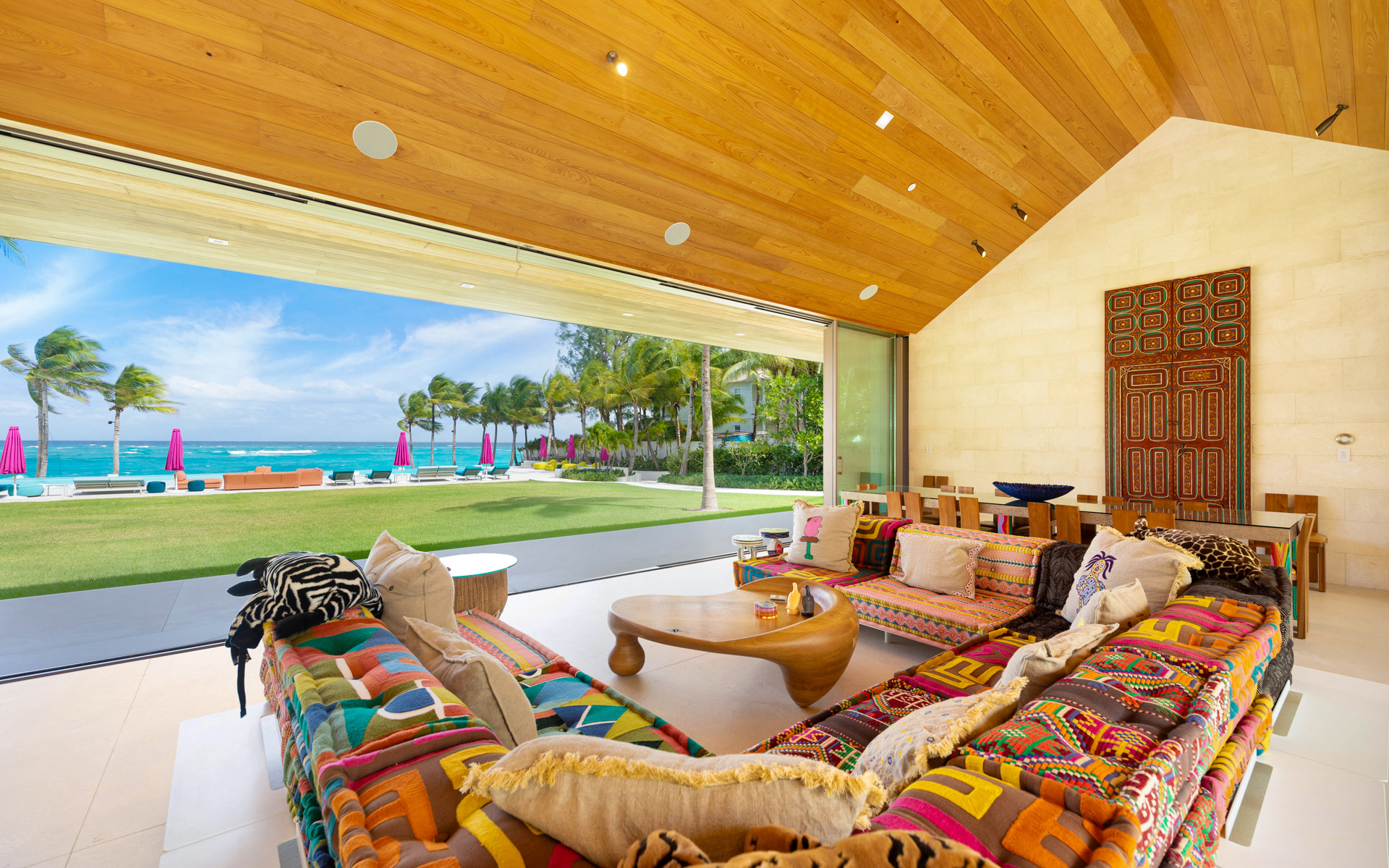 The largest structure is a striking rectangular residence built around an open central courtyard. Breezeways connect the air-conditioned rooms beneath an uninterrupted roofline that wraps the entire building. Designed with clean, modern lines to maximize indoor/outdoor living, the main living room features soaring cypress cathedral ceilings and expansive sliding glass doors that recess into the walls, seamlessly blending lush outdoor greenery with vibrant interior spaces. The chef’s kitchen also captures sweeping ocean views and is complemented by an inviting family room. In addition to a 40-seat private theatre and several guest suites, the residence includes a meticulously curated wine cellar, offering a refined space for storage and tasting.