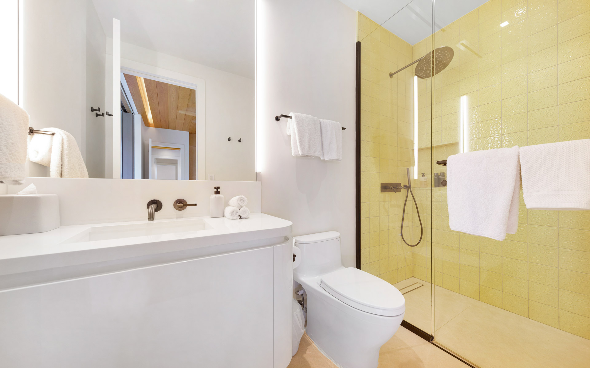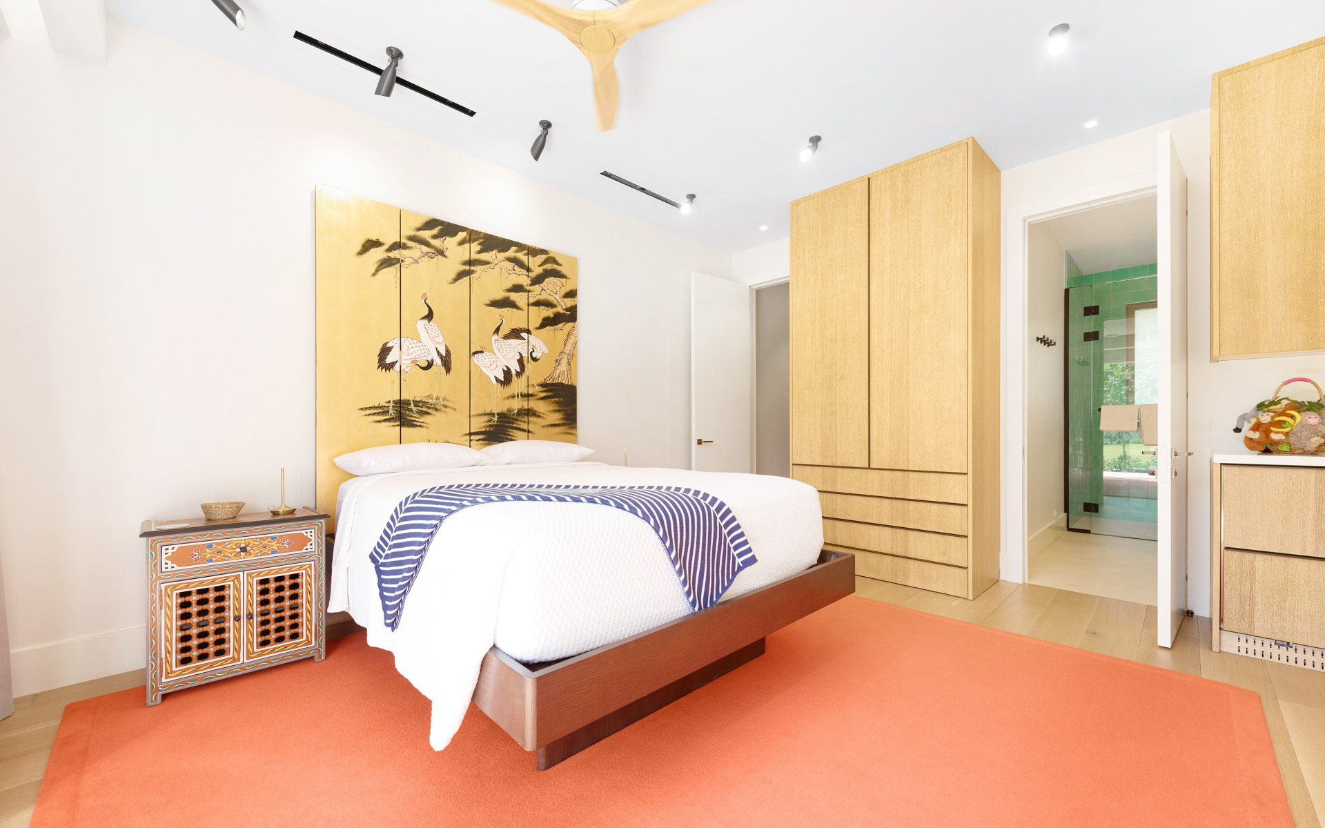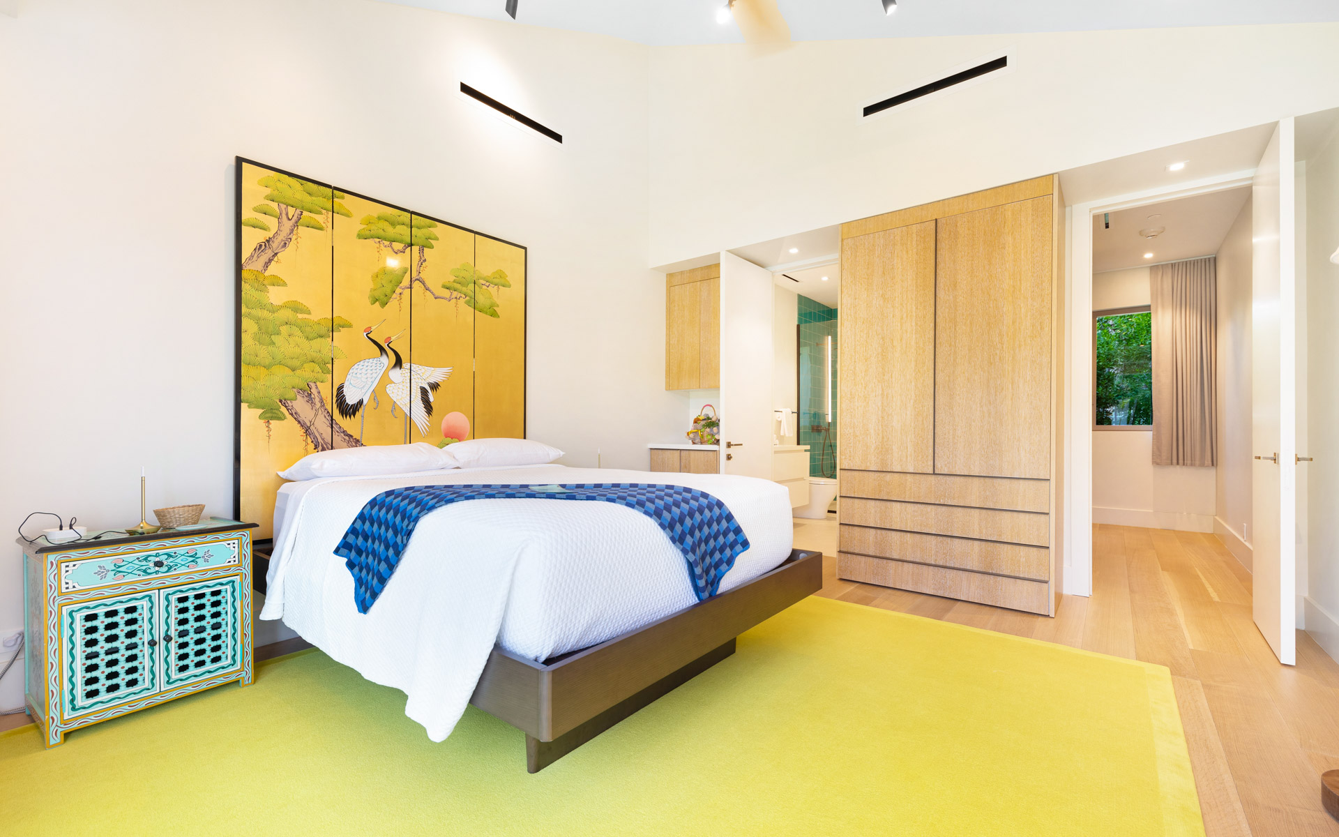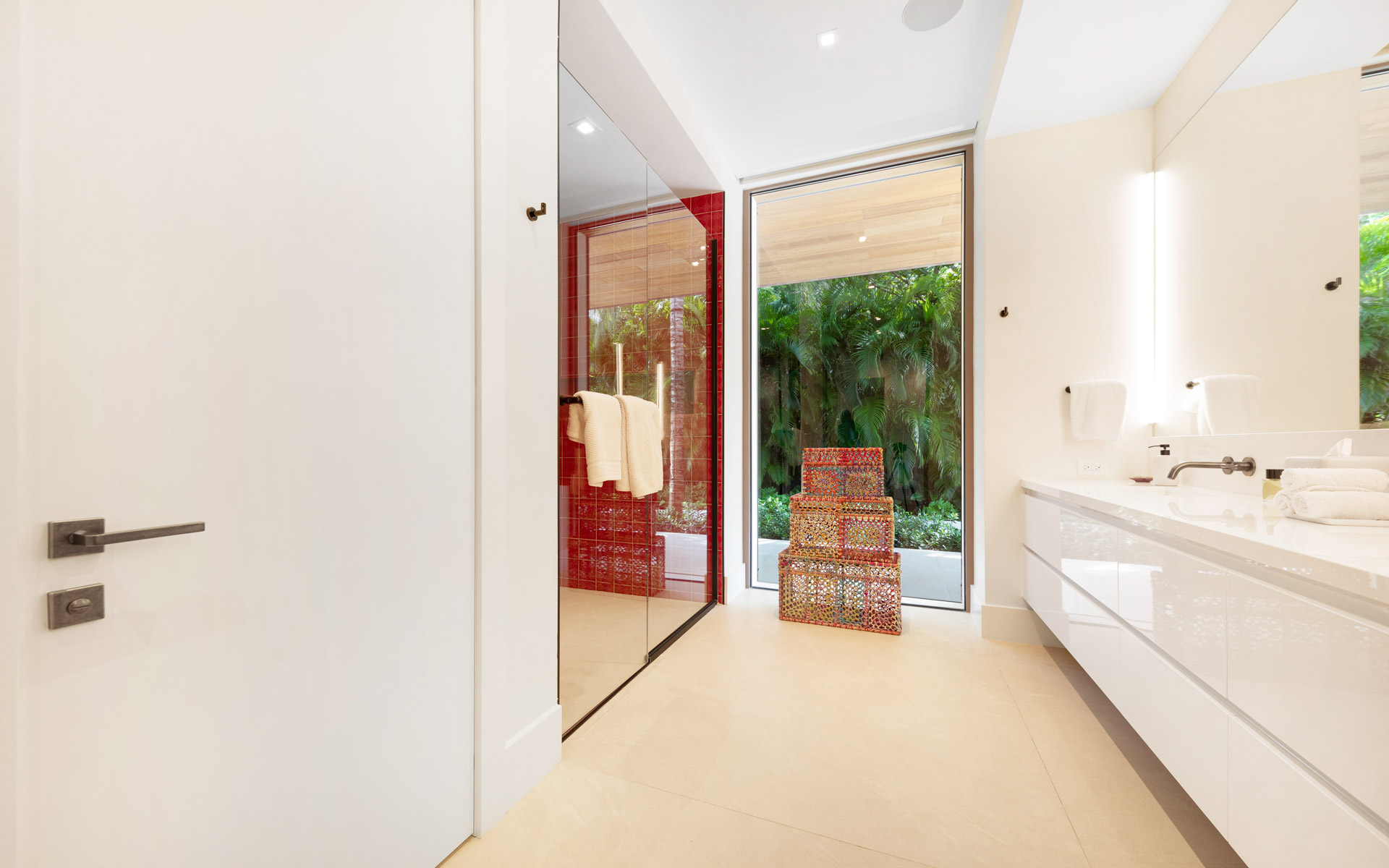 The largest structure is a striking rectangular residence built around an open central courtyard. Breezeways connect the air-conditioned rooms beneath an uninterrupted roofline that wraps the entire building. Designed with clean, modern lines to maximize indoor/outdoor living, the main living room features soaring cypress cathedral ceilings and expansive sliding glass doors that recess into the walls, seamlessly blending lush outdoor greenery with vibrant interior spaces. The chef’s kitchen also captures sweeping ocean views and is complemented by an inviting family room. In addition to a 40-seat private theatre and several guest suites, the residence includes a meticulously curated wine cellar, offering a refined space for storage and tasting.